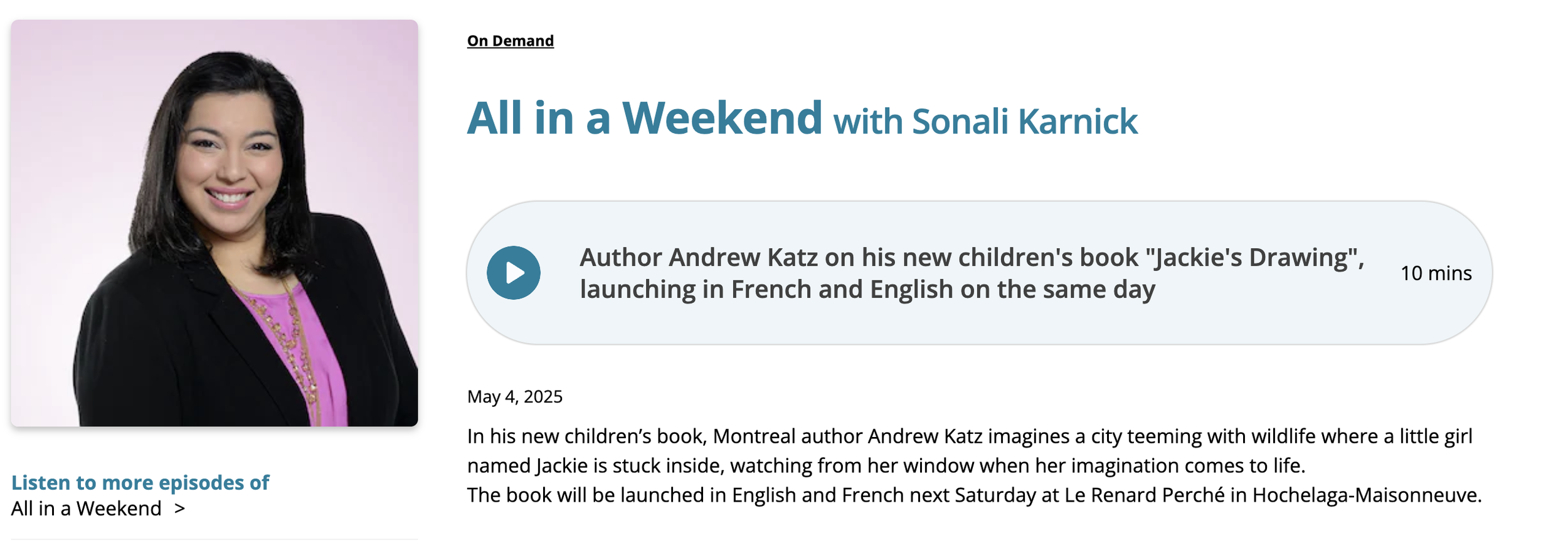 As the days wear on into weeks and months, Jackie eventually loses the heart to do anything, even to draw. But one day, in the canal below her window, a dolphin leaps into the air. Soon, a moose, an eagle and other animals begin to wander into the city—a sight that inspires Jackie to pick up her pencils again and create a drawing unlike any she has ever made.