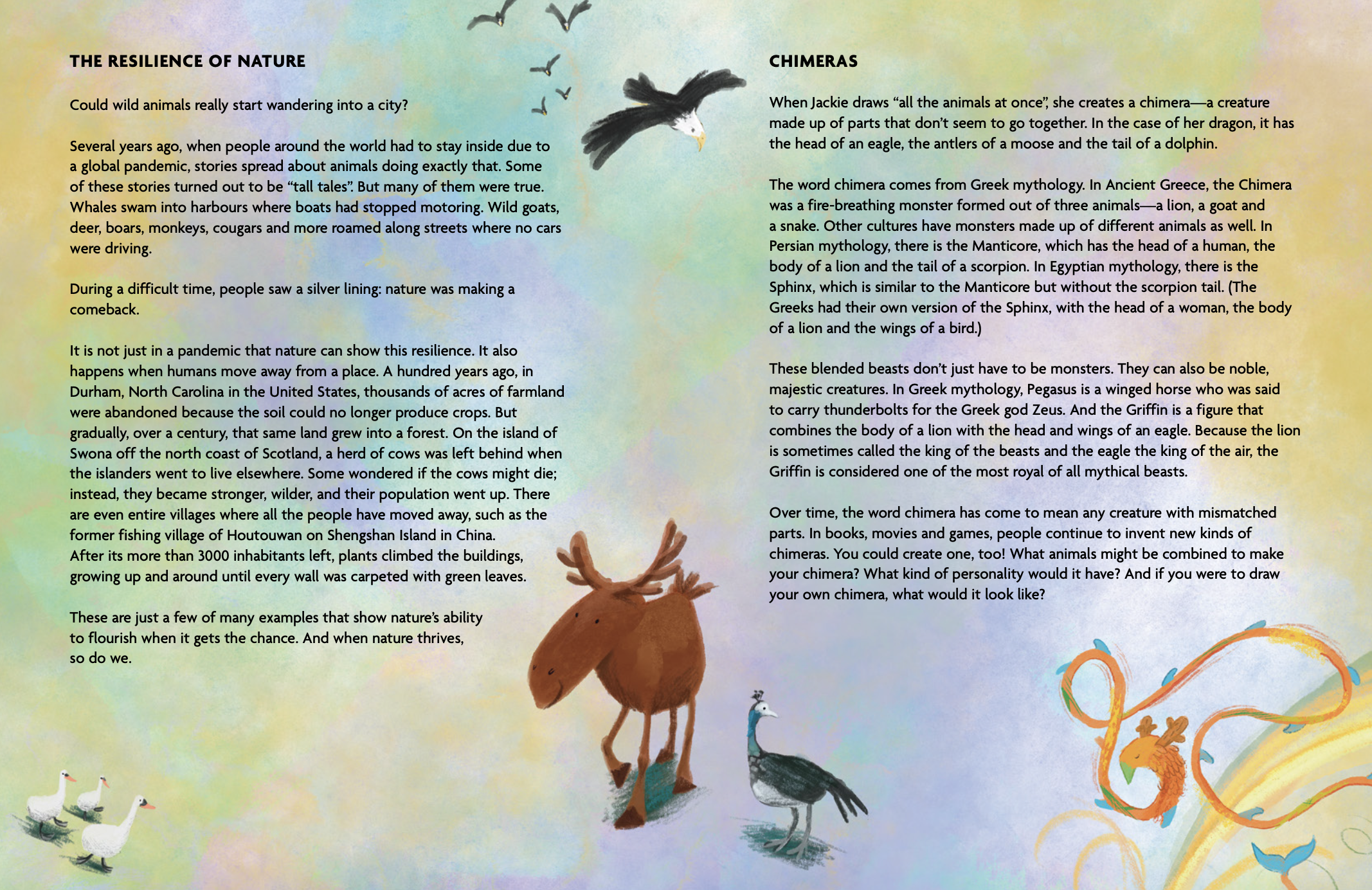 Two additional pages at the back of the book describe real-life examples of nature’s resilience and teach kids about “chimeras” (fantastical creatures with mismatched parts).
